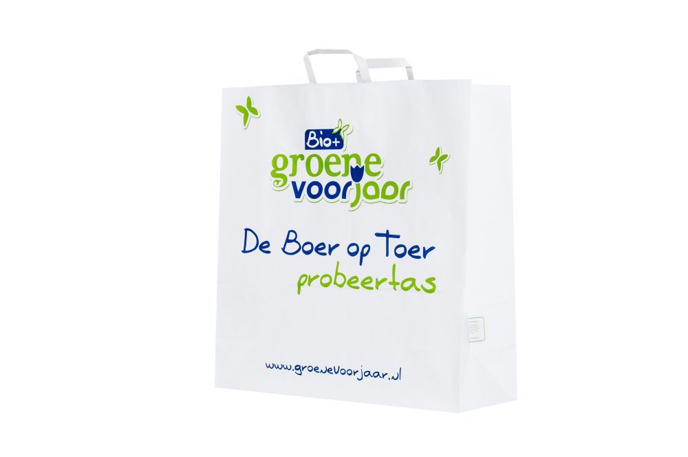 Papieren draagtassen met platte papieren handgrepen, aan de binnenzijde bevestigd met een verstevigingsblad