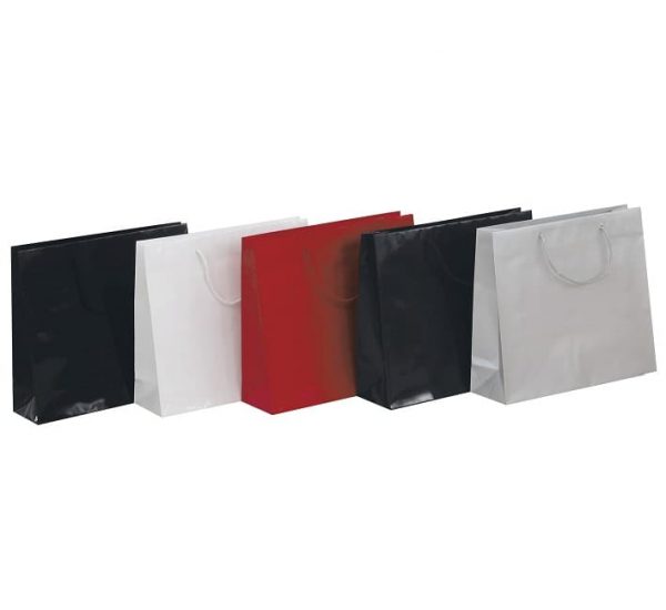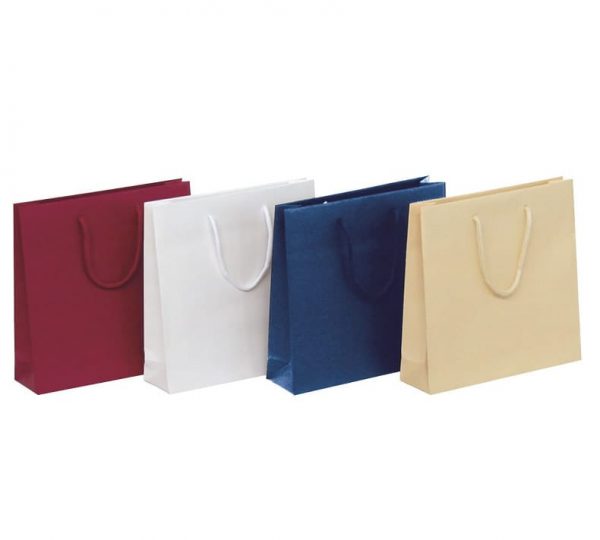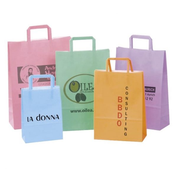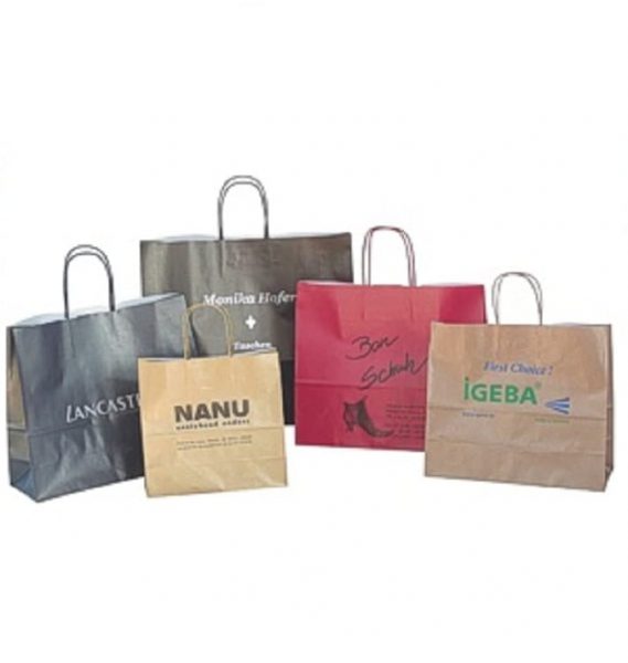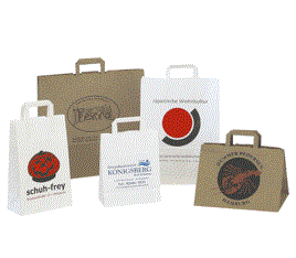Papieren draagtassen met gedraaid papieren koordjes, aan de binnenzijde bevestigd in de omslag