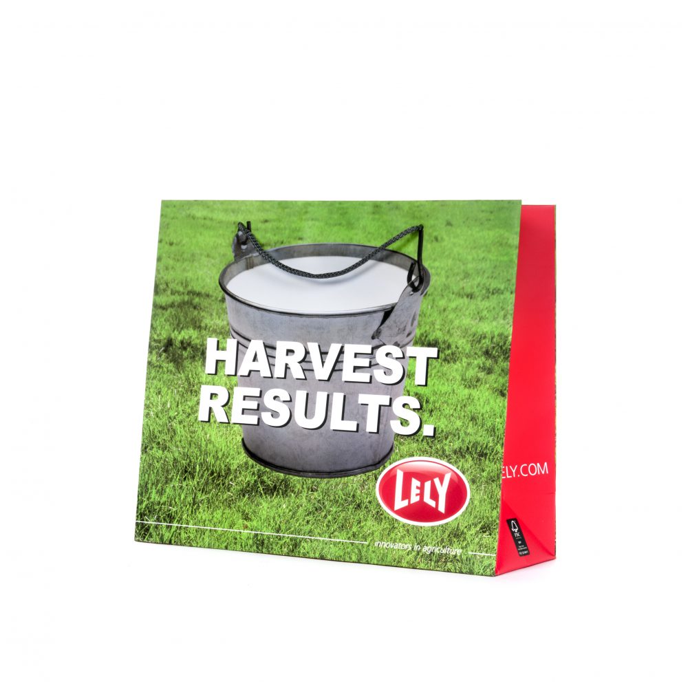 De papieren tas van Lely werkt de illusie dat de drager een emmer vast heeft. Het voorzien van creatieve uitingen zorgt er over het algemeen voor extra aantrekkelijkheid en zichtbaarheid van de draagtassen. Daarnaast biedt het ook een extra kans voor mond-tot-mond reclame, doordat de drager in sociale situaties over deze draagtas kan praten over de humoristische vormgeving.
