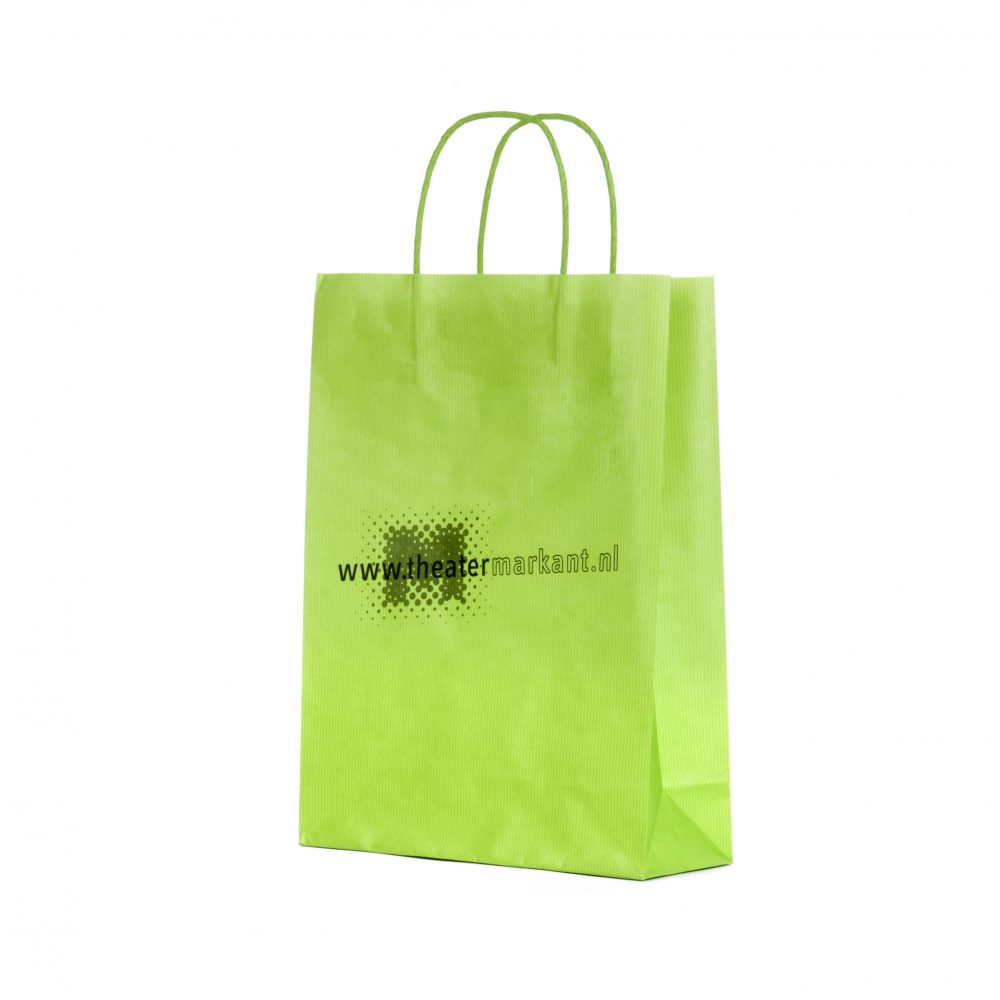 Theather Markant heeft deze papieren draagtassen in het appelgroen besteld. Waarbij zij gekozen hebben voor relatief eenvoudige en voordelige bedrukking.