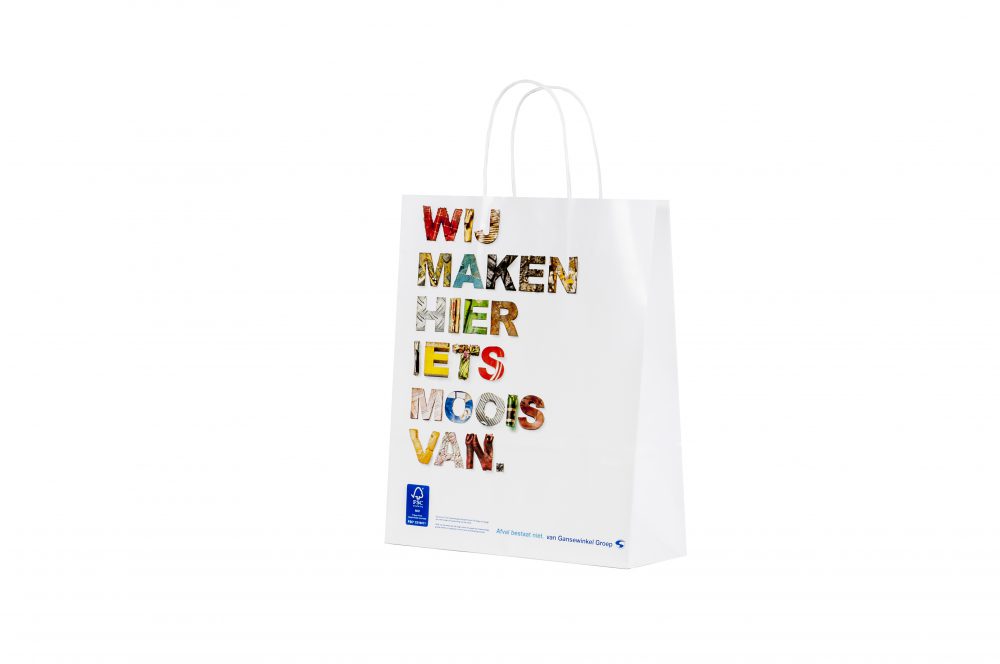 Papieren draagtassen met witte gedraaid papieren koordjes, aan de binnenzijde bevestigd met een verstevigingsblad