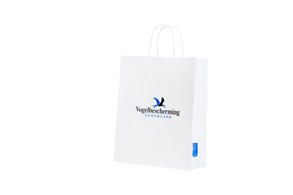 Papieren draagtassen met witte gedraaid papieren koordjes, aan de binnenzijde bevestigd met een verstevigingsblad