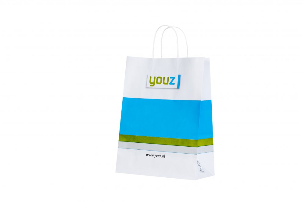 Papieren draagtassen met gedraaid papieren koordjes, aan de binnenzijde bevestigd met een verstevigingsblad